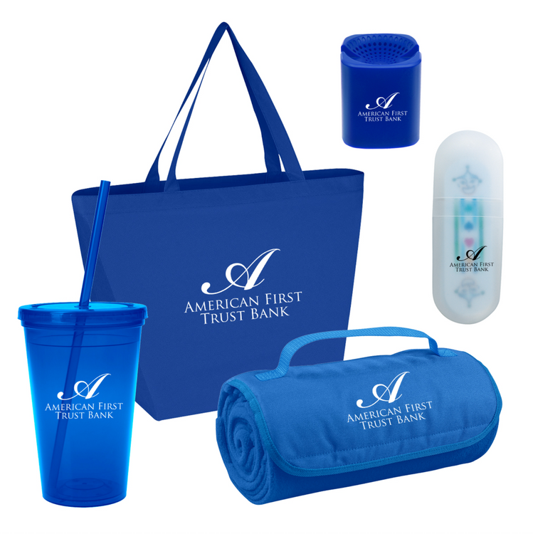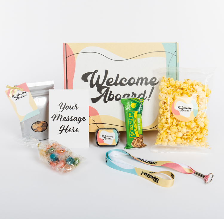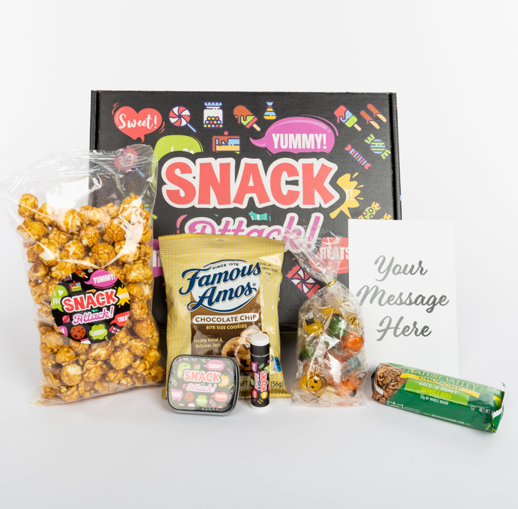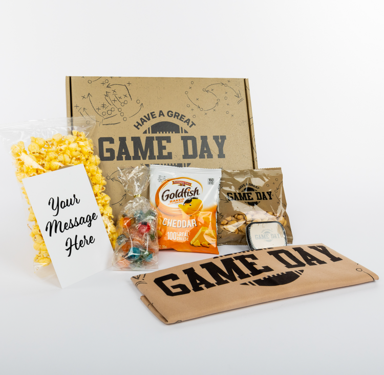 Set Includes #MS22 Mug Stuffers, #GPS Gourmet Popcorn Single, #ST02 Small Tin, #ZSW5 Zagasnacks™ Wide Promo Pack Bag, #7854 - 12" x 24" Dye-Sublimated Microfiber Towel, Goldfish Crackers, Crinkle Paper And Customizable Card. Add Your Custom Message On The 4" x 6" Card. Add Your Own Design or Choose From Any Stock Design. Optional Stock Design Shown. Contents Sold As Shown. Pricing: QTY 50 pcs. $24.99 ea. COLORS AVAILABLE MS22: Bag: Clear. GPS: Bag: Clear. ST02: Black. ZSW5: Clear. 7854: White with Gray. Goldfish Crackers: As shown. Crinkle: Black. FILLERS AVAILABLE MS22: Fruit Balls GPS: Butter Popcorn ST02: Peppermints ZSW5: Shelled Peanuts APPROXIMATE SIZE 11 ¼" H x 9" W x 3" D IMPRINT AREA AND METHOD Card: 4" W x 6" H SET UP CHARGE $50.00(G). Additional set up charges may apply for different imprint type or multi-color imprint on item. Set up charges also apply to re-orders. OPTIONAL IMPRINT Add $200.00(G) set up charge. MOQ 150, No LTM. Items available for optional imprint: ZSW5, 7854,ST02, GPS INDIVIDUAL DROP SHIPPING Add $17.00(G) per piece for individual drop ships. Pricing includes fulfillment, mailer packaging and shipping. Call for more information and pricing on different size insert cards. SET UP CHARGE $50.00(G). Additional set up charges may apply for different imprint type or multi-color imprint on item. Set up charges also apply to re-orders. Shipping & handling and all applicable sales tax additional.