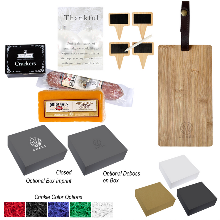 Kit Includes #75034 Cheese Markers, #76137 Bamboo Cutting Board, Dry Cured Salami, Cheese And Crackers. Pricing Includes 1-Color/1-Location Imprint On #76137 Bamboo Cutting Board. Cheese Markers, Dry Cured Salami and Cheese Included As Shown. Includes choice of stock design or use your own custom art on included card. QTY 10 pcs. $77.80 ea. QTY 20 pcs. $67.65 ea. QTY 50 pcs. $58.83 ea. QTY 100 pcs. $51.16 ea. QTY 250 pcs. $44.49 ea. Create Your Own Message With The Included Insert Card. Add Your Own Design or Choose From Any Stock Design. Optional Stock Design Shown. COLORS AVAILABLE 75034: Natural. 76137: Natural with Black or Brown Leatherette Strap. Must specify on PO. Box: Natural, White, Gray or Black. Crinkle Paper: Black, Blue, Green, Red or White. Must Specify on PO. If no color is specified on PO, default crinkle color is black. IMPRINT 76137: Laser Engraved or Debossed Optional Box: Silk-Screen or Debossed IMPRINT COLORS 76137: Laser Engraves Tone On Tone. No Oxidation. IMPRINT AREA AND METHOD 76137: Cutting Board: Laser Engraved: 3" W x 3" H • Optional Leatherette Strap: Debossed: 2 ¾" W x 5/16" H Optional Box: Silk-Screen: 5" W x 5" H • Deboss 3" W x 3" H (Imprint Will be The Same On All Items And Box) SECOND POSITION 76137: Strap: Add .50(G) per piece. APPROXIMATE SIZE 75034: 3" W x 6 ¼" H 76137: 6" W x 11 1/5" H x 2/5" D Box: 12" H x 10 ½" W x 3 ?" D SET UP CHARGE $45.00(G). Additional set up charges may apply for different imprint type on item. Set up charges also apply to re-orders. Optional Box: $95.00(G). Set Up charges also apply to re-orders. OPTIONAL Optional Box Imprint: Silk-Screen: $4.50(G) per piece (1 Color Only) • Deboss: $5.00(G) per piece. PLEASE NOTE Bamboo products are prone to color variances and will vary between dye lots. Color variances are to be expected as no two bamboo products will be the exact same shade even within the same dye lot. Laser appearance will vary from piece t