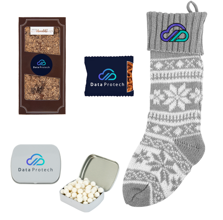 Kit Includes #1938 Holiday Stocking, #ZSW5 Zagasnacks™ Wide Promo Pack Bag, #ST02 Small Tin And #CHOCBAR Chocolate Bar Pricing Includes 1-Location Embroidery On #1938 Holiday Stocking And Full Color Imprint In One Location On #ZSW5 Zagasnacks™ Wide Promo Pack Bag, #ST02 Small Tin And #CHOCBAR Chocolate Bar 25 50 100 250 500 $33.22 $28.89 $25.12 $21.84 $18.99 COLORS AVAILABLE 1938: Gray or Tan. ST02: Tin: White, Black, Silver, Pink (PMS 230) or Red (PMS 200). CHOCBAR: As Shown. FLAVORS AVAILABLE CHOCBAR Everything You Love and Cookie Dough FILLERS AVAILABLE ZSW5: Animal Crackers, Chex Mix, Dog Bones, Gummy Bears, Jolly Ranchers, Peanuts In Shell, Pretzel Snaps, Starbursts or Tootsie Rolls. ST02: Signature Peppermints, Jelly Beans, Gum, Chocolate Littles, Hearts, Sugar-Free Peppermints IMPRINT COLORS CHOCBAR: Four Color Process ZSW5: Four Color Process Film ST02: Decal SET UP CHARGE $165.00(G). Additional set up charges may apply for different imprint type or multi-color imprint on item. Set up charges also apply to re-orders. MULTI-COLOR IMPRINT ST02: Direct Imprint: Add .35(G) per piece plus an additional set-up charge. EMBROIDERY INFORMATION 1938: Price includes up to 7 thread colors and 7,000 stitches. TAPE CHARGE 1938: $100.00(G) for all new orders. For designs exceeding 7,000 stitches, add $35.00(G) per each additional 1,000 stitches to the embroidery tape charge and .35(G) running charge for every additional 1,000 stitches to the price of the socks. Additional stitch charges also apply to all free tape orders. THREAD COLORS 1938: All standard Madeira thread colors. Add .35(G) per cap for Metallic Gold & Silver, per 1,000 stitches. PACKAGING Bulk. PLEASE NOTE Production time is 10 days after proof approval. Less Than Minimum Orders Not Available On Kits. STOCK DESIGNS This product has Stock Designs available. Shipping & handling and all applicable sales tax is additional.